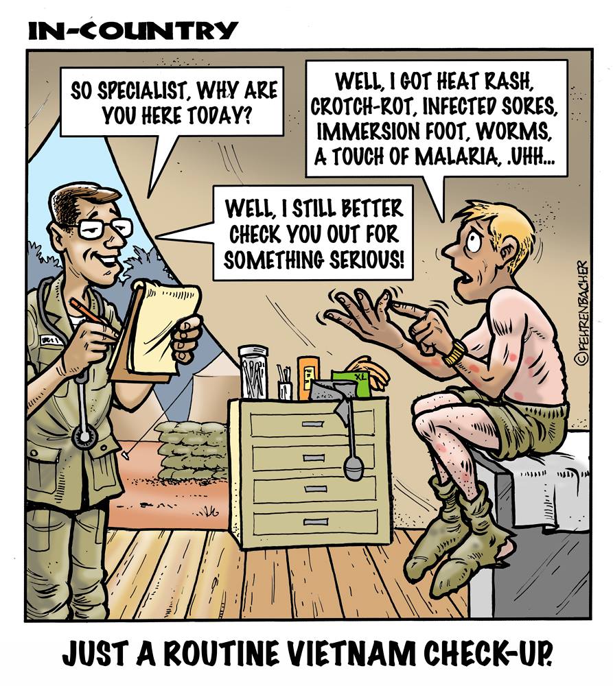 Phil enlisted in the Army in 1965 where you served for years in Vietnam.  He became a graphic designer and has worked for the state of Oregon for 26 years.  He retired in 2003 and started the Cartoon "In-Country".  The cartoons reflect his experiences during his tour of duty in South Vietnam.